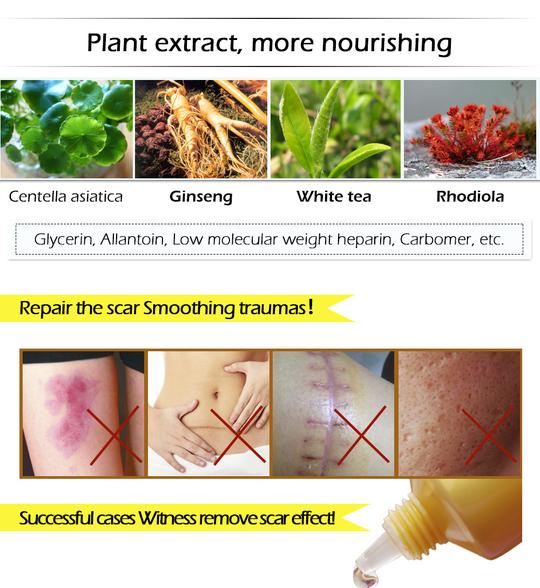 Usage: Use it several times daily. Before use, clean and disinfect the wounds or scare, and apply some gel to it with a soft massage.