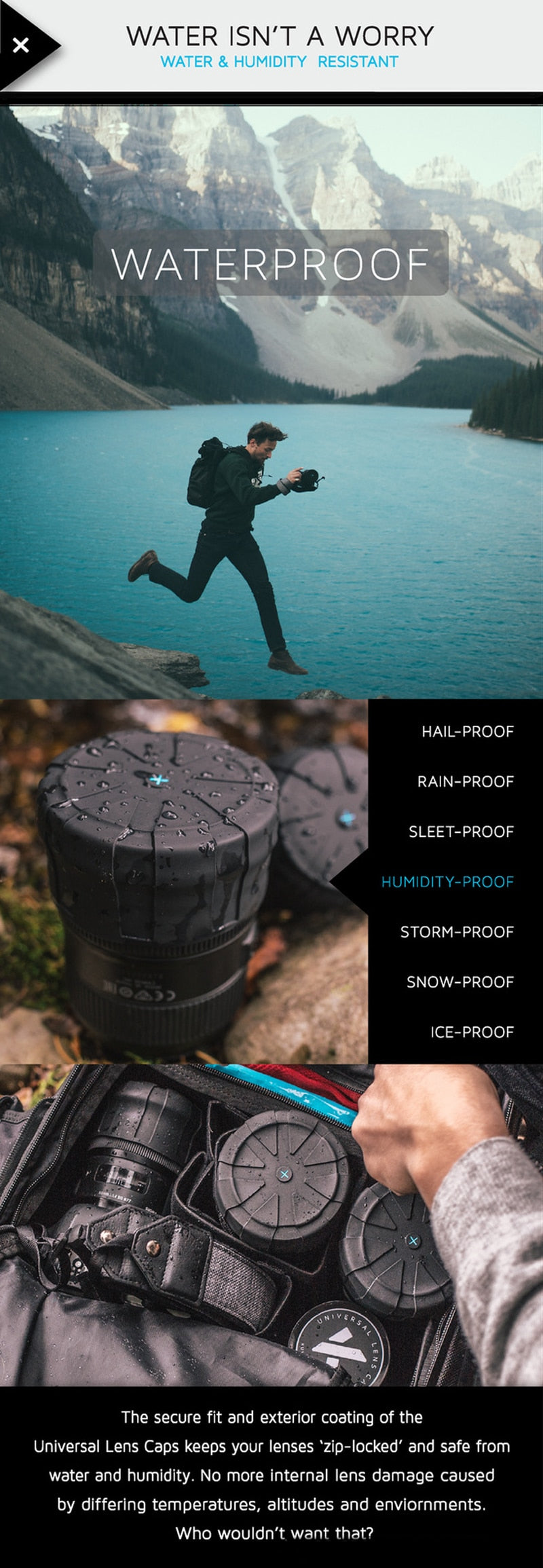 ONE SIZE FITS ALL: It's designed to fit every DSLR & Full Frame Mirrorless Camera lens with an airtight/watertight seal, holding up to elements the most ambitious photographers might endure. Now, you can travel stress-free knowing you won't lose your lens cap, it won't fall off, and you can go anywhere knowing you have the lens protection you need against the elements.