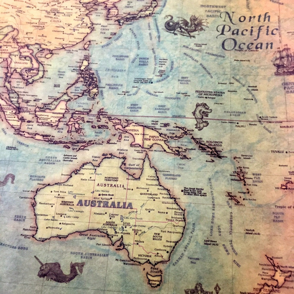 The Vintage Nautical World Map Poster is a beautiful, vintage style, decorative addition to your home or office that is sure to add old world charm to any room you display it in. The map has gorgeous coloring with that wonderful browning and worn shabby look of grungy, real antique maps with fine detailing, right down to the elegant compass rose.